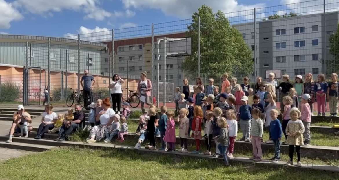 Die Kinder überraschten ihren Besuch mit einem tollen Bühnenprogramm. Als Bühne dienten uns die Treppen vom Sportplatz. Dort sangen wir tolle Lieder und bewegten uns alle zur Musik. Der große Applaus gab uns ein tolles Gefühl und wir konnten im Anschluss den leckeren Kuchen verspeisen. Heike hatte vorher im Lehmbackofen tolles Brot gebacken, bei dem herzlich zugefasst wurde. Es gab interessante Gespräche und auf dem Sportplatz durfte jeder noch mal sein Können unter Beweis stellen beim Leitergolf-Wurfspiel, Dosenwerfen, Dosenmemory und beim Bestimmen von Kräutern.